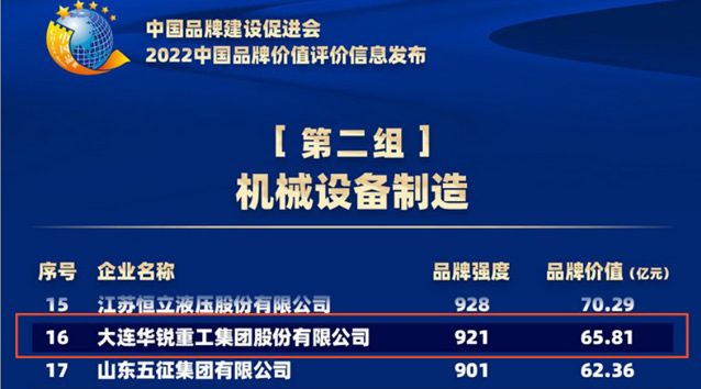 9月5日,中国品牌建设促进会、中国资产评估协会、新华社民族品牌工程办公室等单位在京联合发布了“2022中国品牌价值评价信息”。榜单显示,大连重工的品牌价值评估结果为65.81亿元,品牌强度921分,是辽宁省机械设备制造类唯一上榜企业,位列中国机械设备制造类企业第16位。