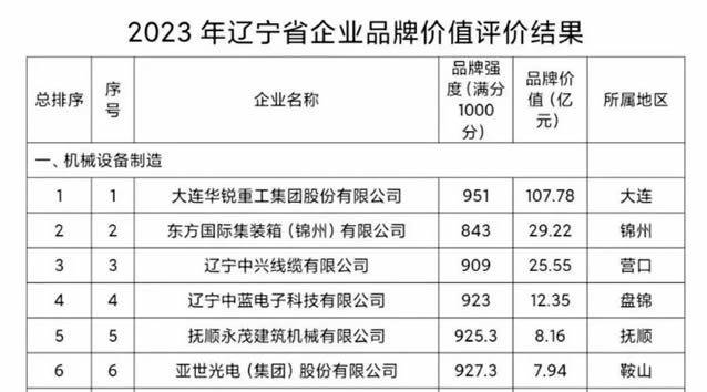 近日,辽宁省品牌建设促进会联合辽宁广播电视台发布了2023年度辽宁省品牌价值评价信息,评价结果显示,大连重工以951分(满分1000分)的品牌强度、107.78亿元的品牌价值,位居机械设备制造企业榜第一位。