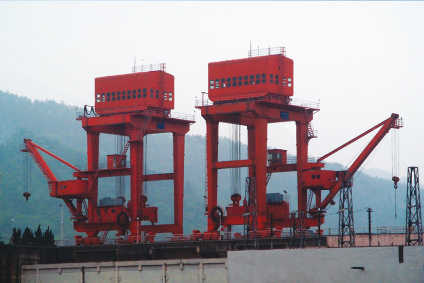 水电站门式起重机是一种门式多功能起重机,主要工作于水电站大坝坝顶或尾平台,用于发电机组进水口工作门、排沙底口事故检修门、拦污栅、泄洪水闸平板工作门等各类闸门的启闭、搬运,用于机电设备安装及坝顶其他设备的吊运等。大连重工研制的该类产品的主要技术特点:起重量大(最大1000t)、超载能力强、跨度较小(常为10-20m)、起升高度大、配有自动化或智能化的水下液压挂梁,可采用各种先进的电气调速系统和PLC及网络控制系统。