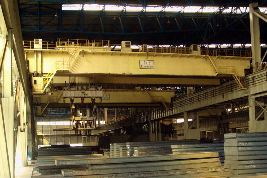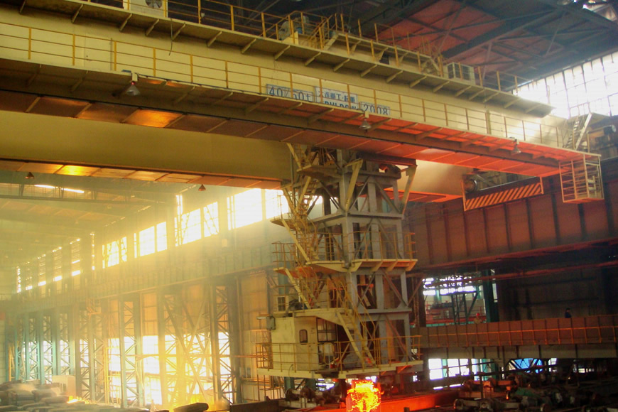 铸造起重机是炼钢连铸工艺中的主要设备之一,主要用于转炉加料跨向转炉兑铁水,在精炼跨将钢水吊运至精练炉或在钢水接受跨将钢水吊运到连铸回转大包台上。大连重工设计制造的75-480吨铸造起重机服务于国内各大钢厂,并出口至印度、巴西、墨西哥、泰国、马来西亚等国家。